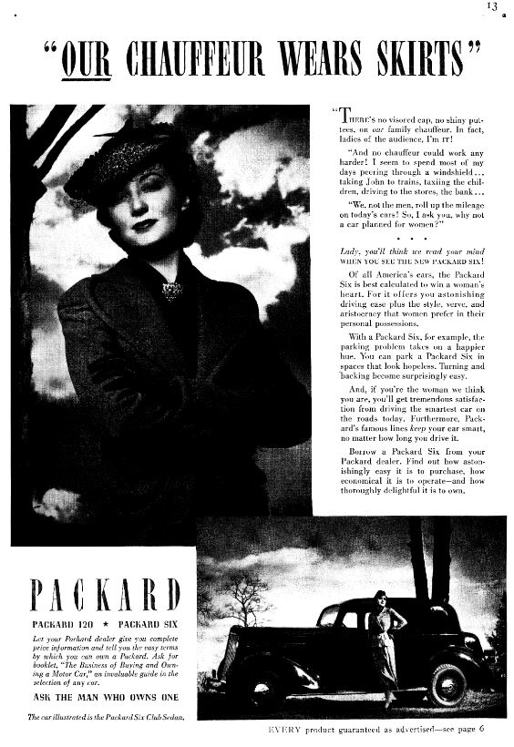 The economy was looking a little better by the spring of 1937.1 The Packard Automobile Company decided to cash in on the prosperity. “From 1930 until World War II, Packard was the foremost luxury automobile, not only in America but internationally as well.”2 This time around Packard advertisers turned their attention to the female market. Especially with the introduction of lower-cost models such as the Six and One-Twenty.3